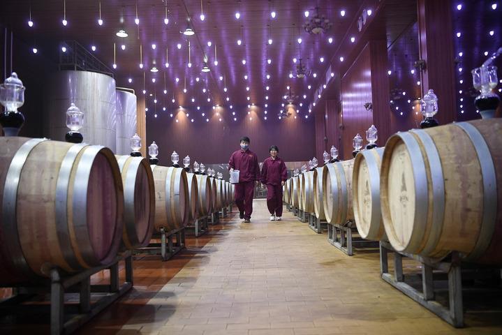 風(fēng)從賀蘭山深處吹來,拂過山腳下一眼難望到頭的葡萄園。一座占地面積達(dá)5000平方米的酒窖里,自動化設(shè)備保持四季恒溫恒濕,2000個橡木桶鱗次櫛比,國際葡萄酒大賽獲獎證書一個挨著一個,擺滿了十幾米長的陳列架。