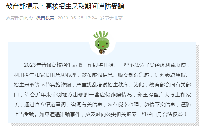 2023年普通高校招生錄取工作即將開始。教育部會(huì)同有關(guān)部門,結(jié)合近年來個(gè)別地方出現(xiàn)的一些虛假詐騙情況,鄭重提醒廣大考生和家長,通過官方渠道查詢、咨詢有關(guān)信息,勿存僥幸心理、勿信不實(shí)信息,謹(jǐn)防上當(dāng)受騙。