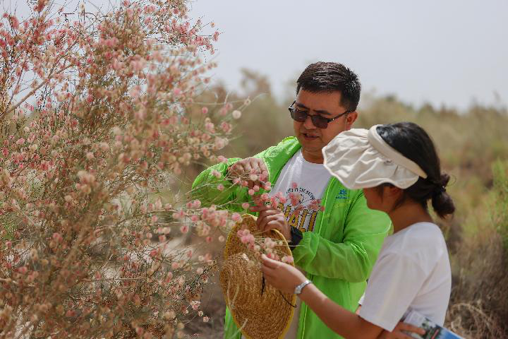 2023年6月12日,在中科院新疆生態(tài)與地理研究所策勒沙漠研究站天然試驗區(qū),買爾當(dāng)和學(xué)生查看沙拐棗生長情況。新華社記者 郝昭 攝