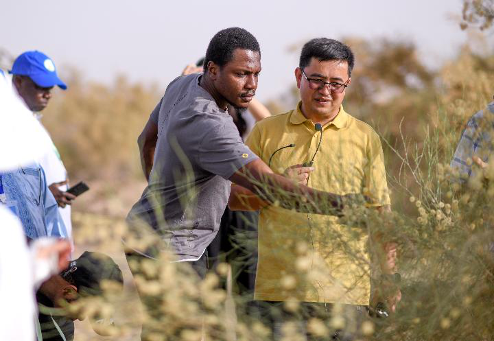 2023年6月13日,在中科院新疆生態(tài)與地理研究所策勒沙漠研究站天然實驗區(qū),中國科研人員買爾當(dāng)(右一)為參加第二屆非洲綠色長城建設(shè)技術(shù)培訓(xùn)班的學(xué)員講解。新華社記者 王菲 攝