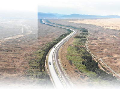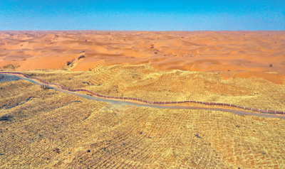 治沙防護體系守護包蘭鐵路平穩(wěn)運行。 |