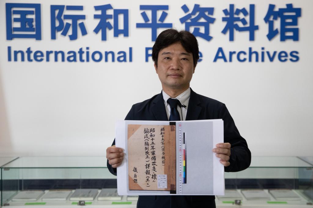 6月1日,在黑龍江外國(guó)語(yǔ)學(xué)院國(guó)際和平資料館,日本學(xué)者松野誠(chéng)也展示新發(fā)現(xiàn)的資料。此前,黑龍江外國(guó)語(yǔ)學(xué)院和侵華日軍第七三一部隊(duì)罪證陳列館聯(lián)合在哈爾濱市向社會(huì)公布了一批部隊(duì)編制資料。這些資料包括關(guān)東軍防疫給水部軍官高等文官職員表、判任文官同待遇者職員表等。新華社記者張濤攝