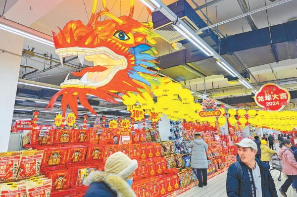 北京各大商超節(jié)日氛圍漸濃,在物美超市玉蜓橋店,新春節(jié)慶商品擺滿貨架,喜慶紅火的龍形掛飾裝點賣場。 記者 鄧偉攝