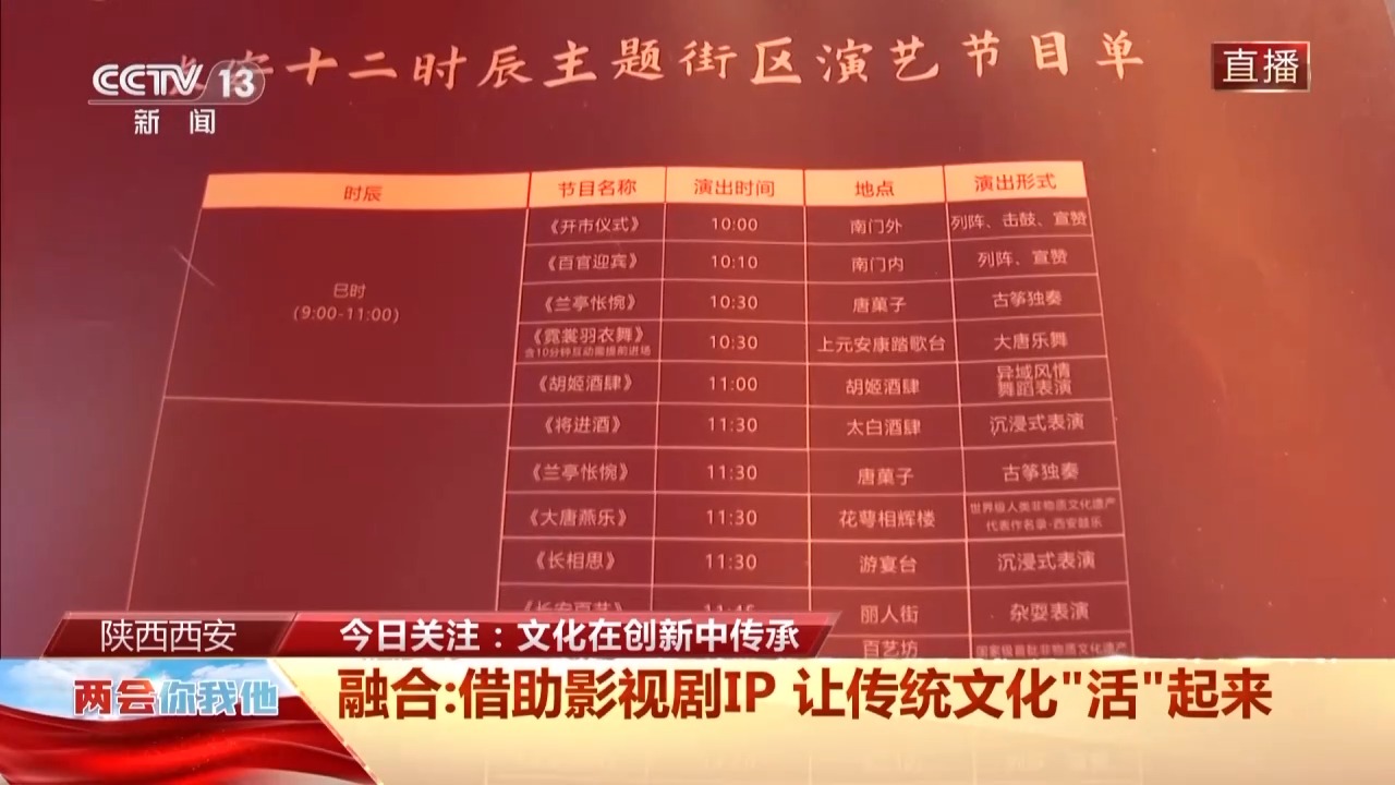 除了道具,這樣的一個(gè)主題街區(qū),小型互動(dòng)表演遍布,這個(gè)節(jié)目單從早上10時(shí)的開市儀式一直到晚上10時(shí)的互動(dòng)演繹,全天有70多場(chǎng)演出,旺季最多的時(shí)候有上百場(chǎng)演出。很多都是互動(dòng)式的表演,比如太白酒肆里,李白的《將進(jìn)酒》一出,總會(huì)出現(xiàn)現(xiàn)場(chǎng)齊誦的熱烈場(chǎng)面。這個(gè)春天,五湖四海游客齊誦唐詩的場(chǎng)景,已經(jīng)成為西安的一道新風(fēng)景。