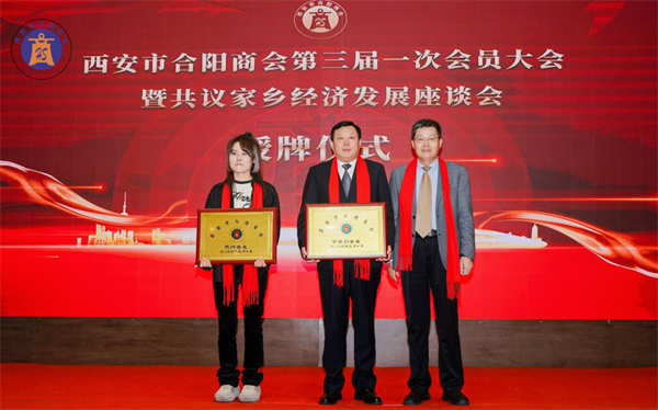 西安市合陽商會會長賈申龍先生和監(jiān)事長劉自力先生為副會長單位授牌。
